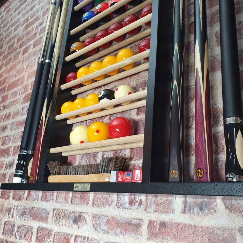 Pratique et esthétique, découvrez notre nouveau porte-queue. Prévu pour 8 queues de billard de 1,10 m à 1,50 m, il vous permet de ranger tous styles de queues (françaises, anglaises et américaines). Pratique, la partie centrale offre un rangement pour 2 jeux de billes complets, quel que soit le diamètre de vos billes.
