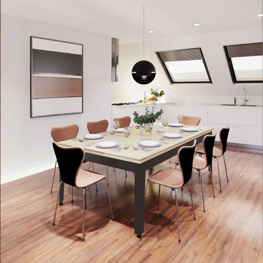 C’est pourquoi nous utilisons un revêtement effet bois étanche et ultra-résistant pour que votre table de salle à manger résiste aux tornades d’enfants et aux copains maladroits. Quant au piétement, celui-ci est en véritable acier épais de 5 mm.