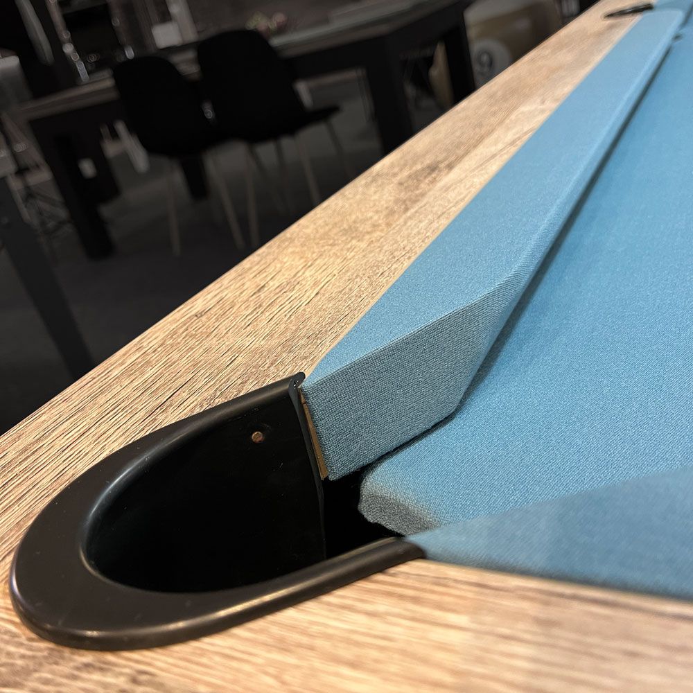 Avec un pied, une ceinture et un tapis noir, associé à un cadre en chêne, voici un style plus authentique qui apportera un côté cosy et chaleureux à votre intérieur. Des couleurs intemporelles avec une touche de modernité dans les formes, vous avez entre les mains une recette parfaite pour une table de billard convertible que vous pourrez conserver au moins pour les 10 prochaines années.