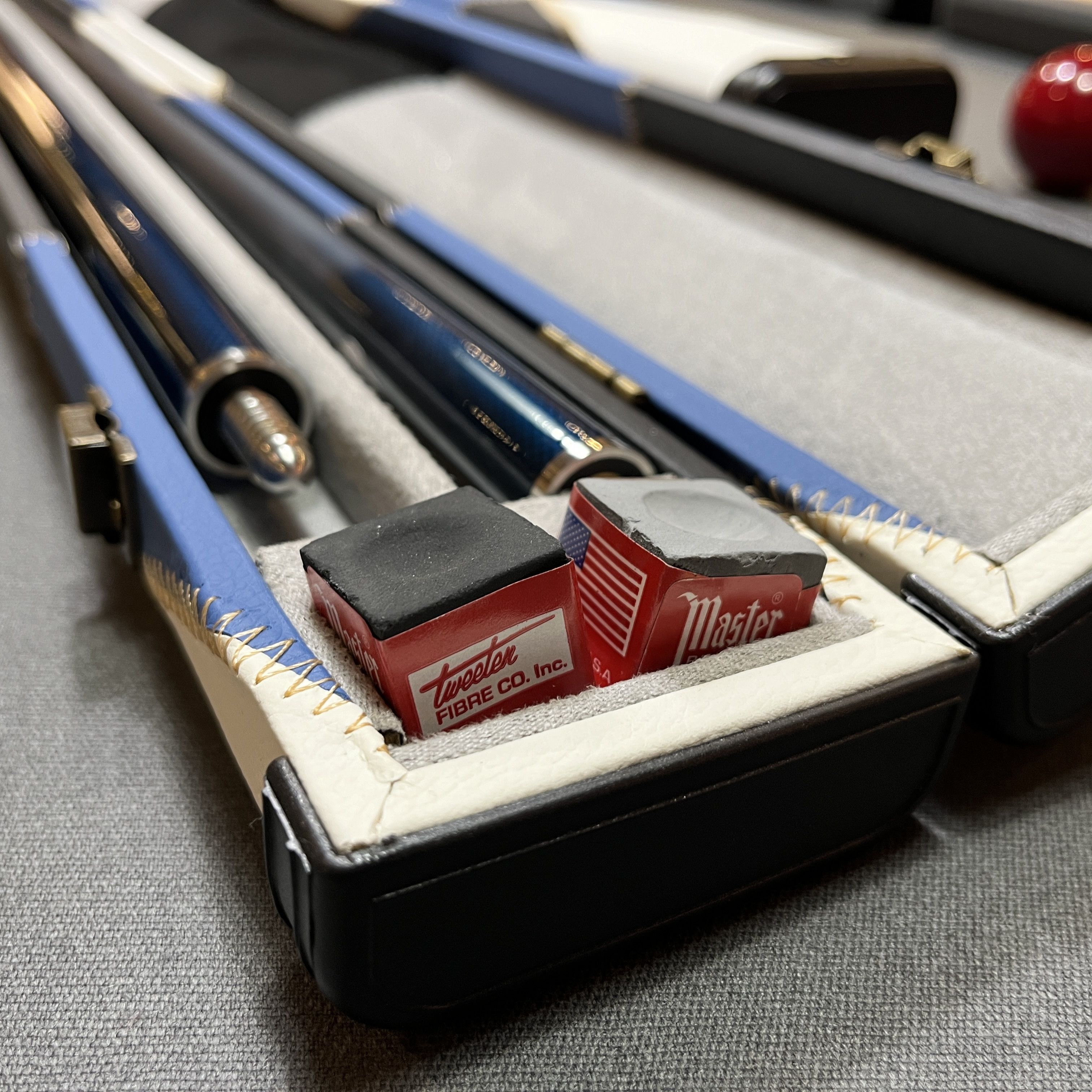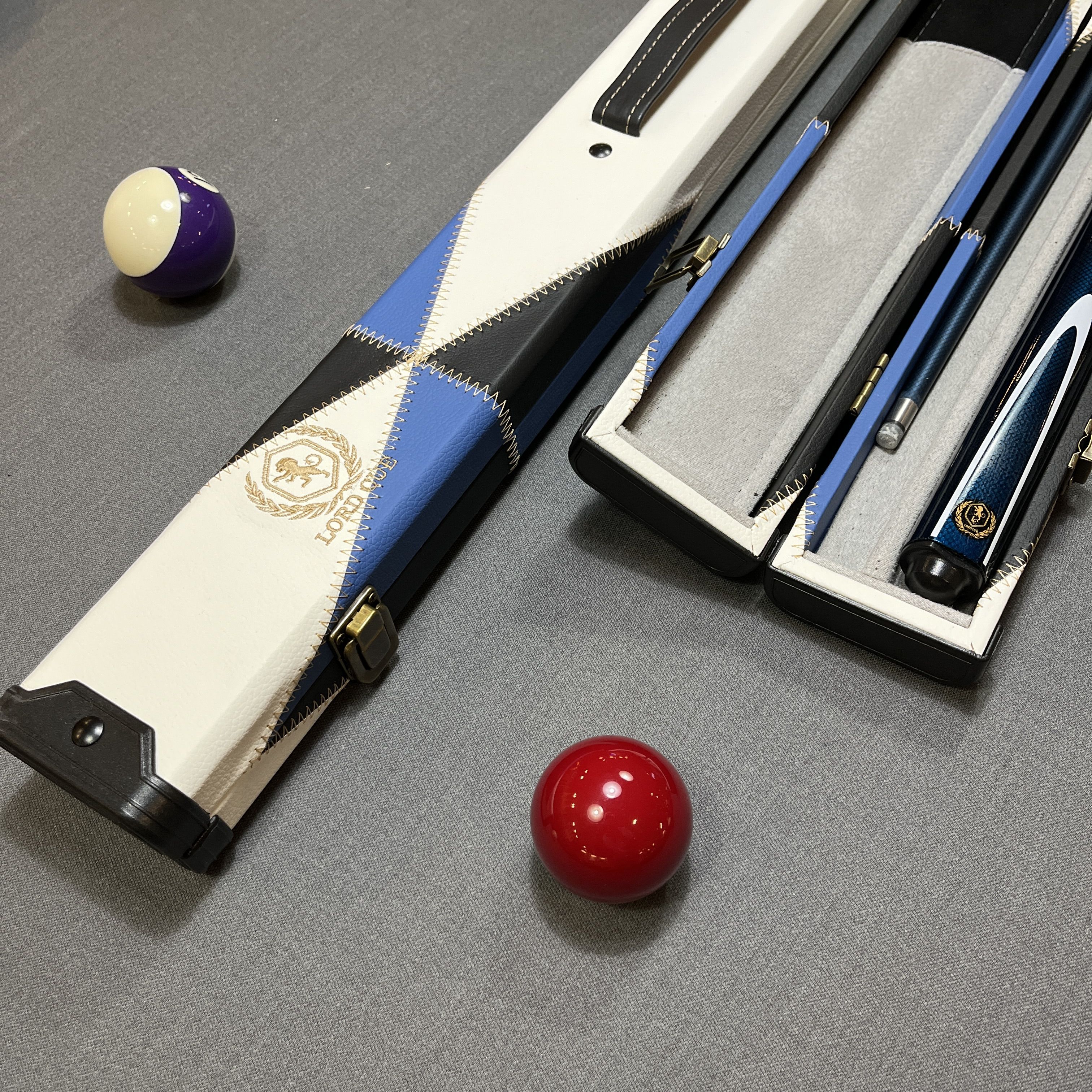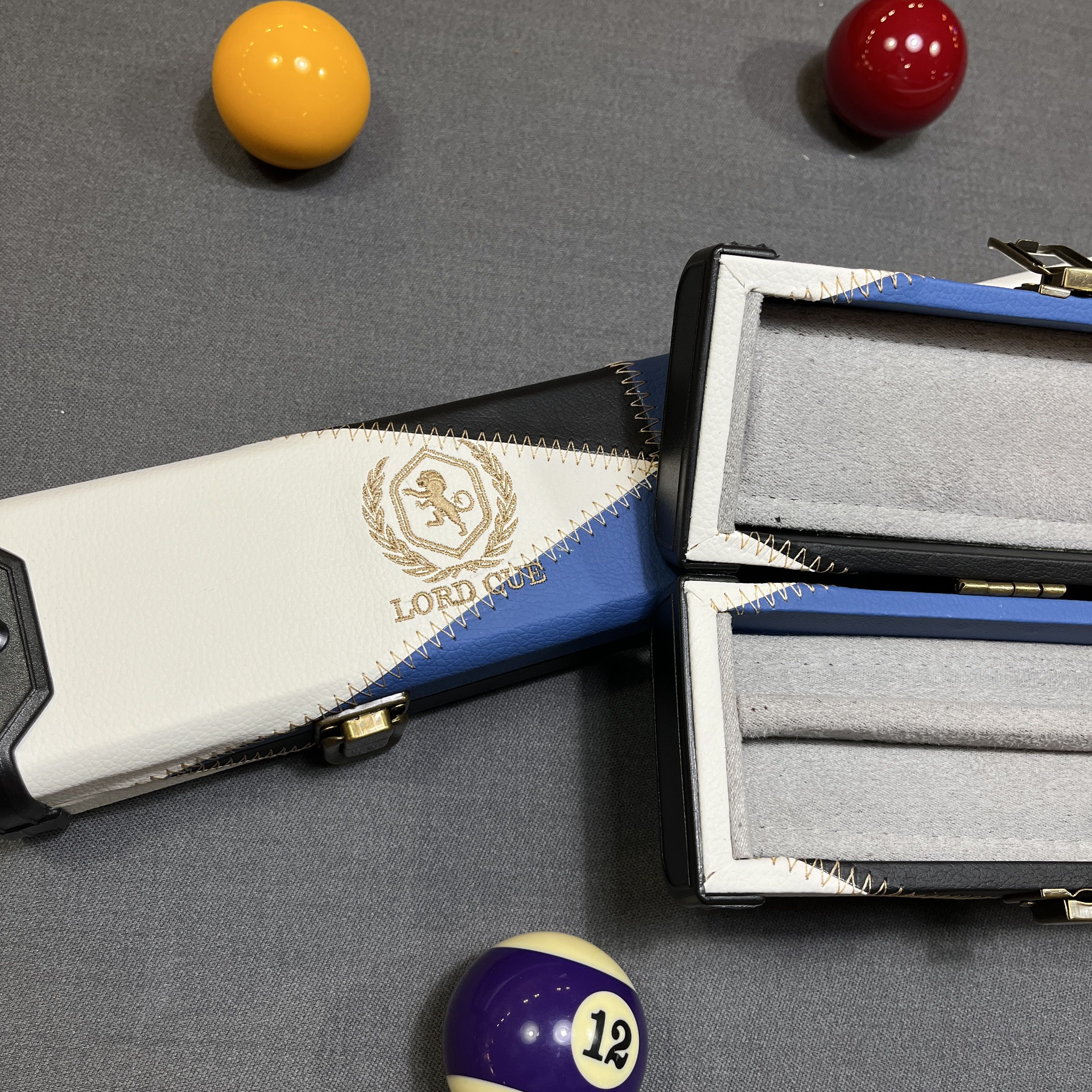 Boitier aux finitions luxe revêtement simili-cuir surpiqué coloris bleu et blanc, renfort anti-usures sur les extrémités. Intérieur avec habillage en tissu Gris et noir prévu pour le rangement d'un fût et une flèche + emplacement pour craie. Une très belle mallette de rangement pour queue de billard 1/2.