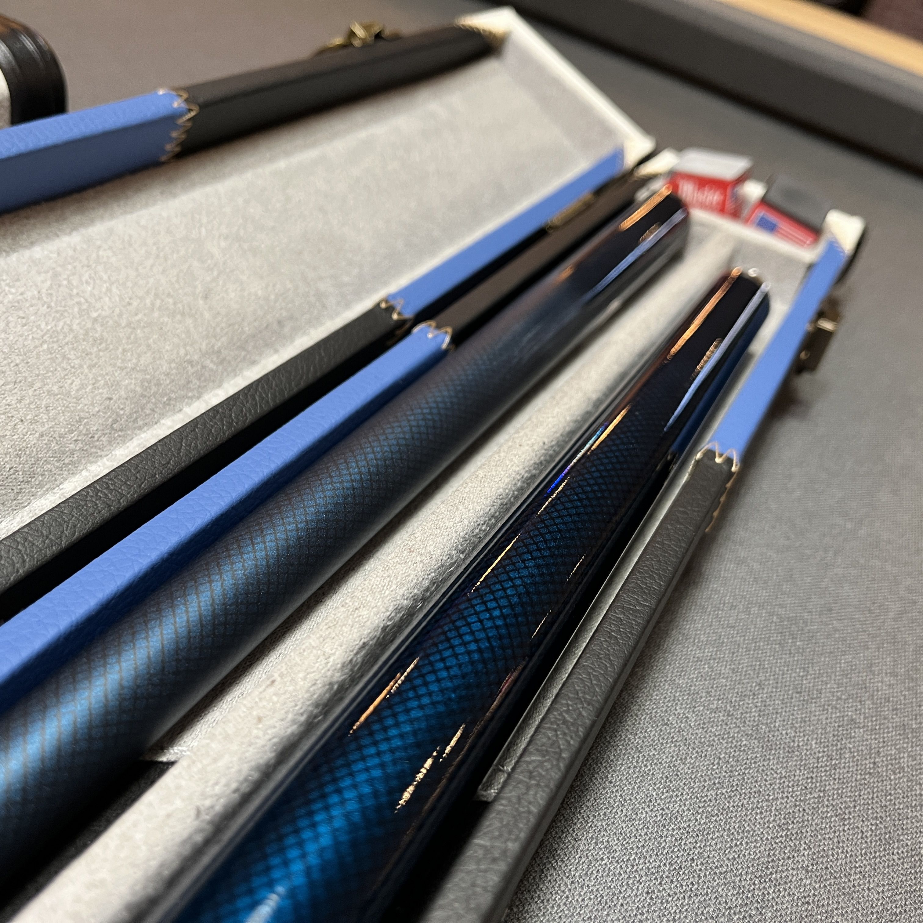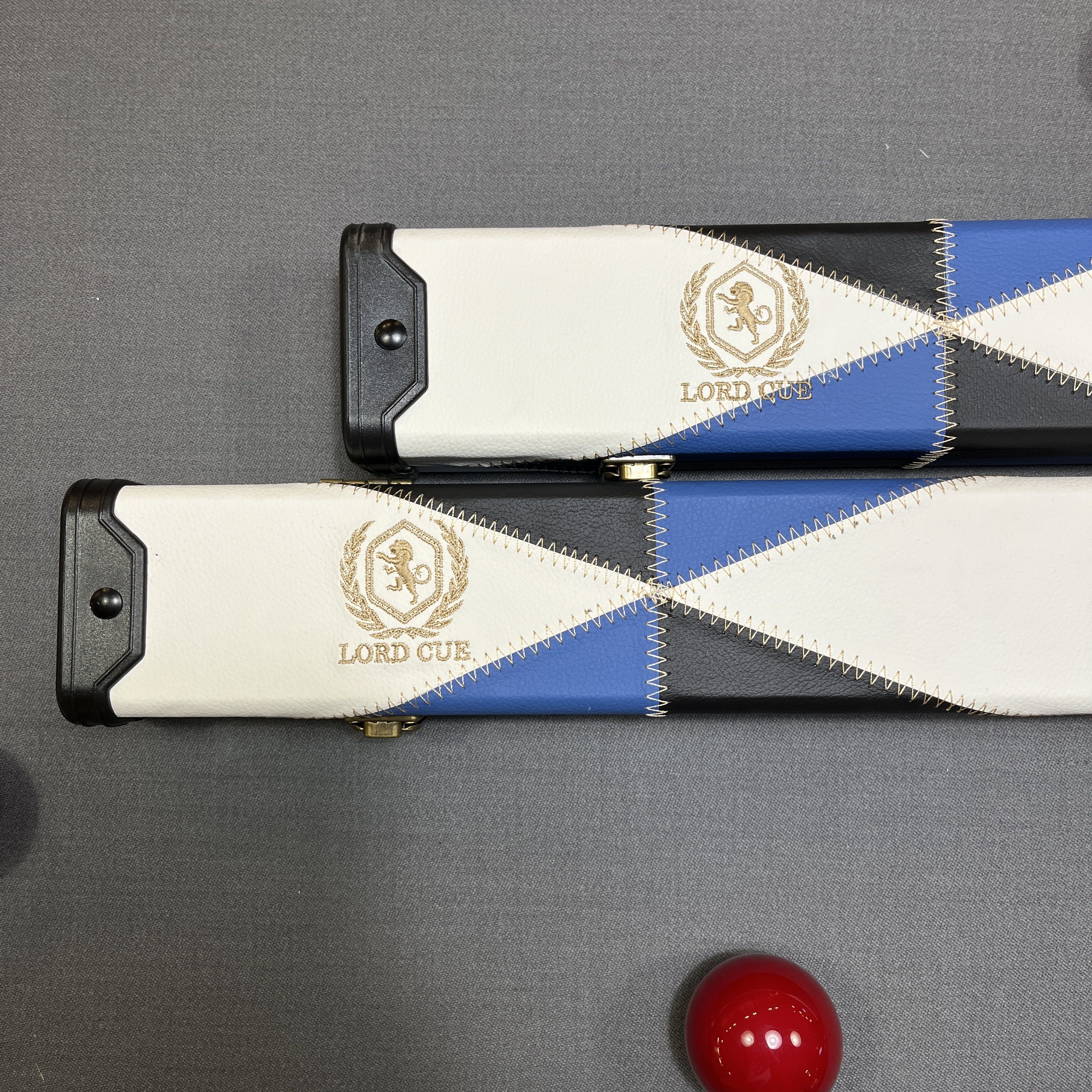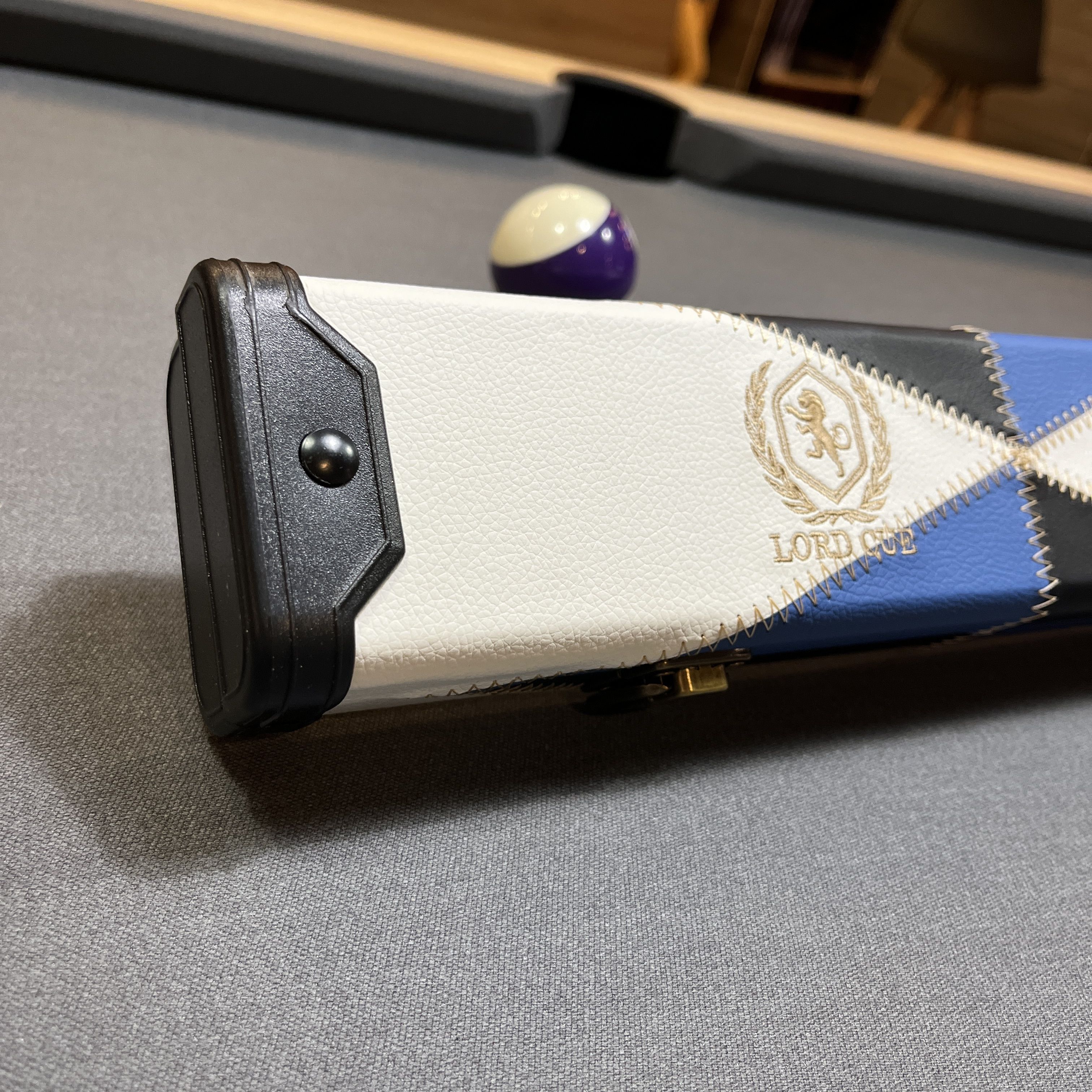 Boitier aux finitions luxe revêtement simili-cuir surpiqué coloris bleu et blanc, renfort anti-usures sur les extrémités. Intérieur avec habillage en tissu Gris et noir prévu pour le rangement d'un fût et une flèche + emplacement pour craie. Une très belle mallette de rangement pour queue de billard 1/2.