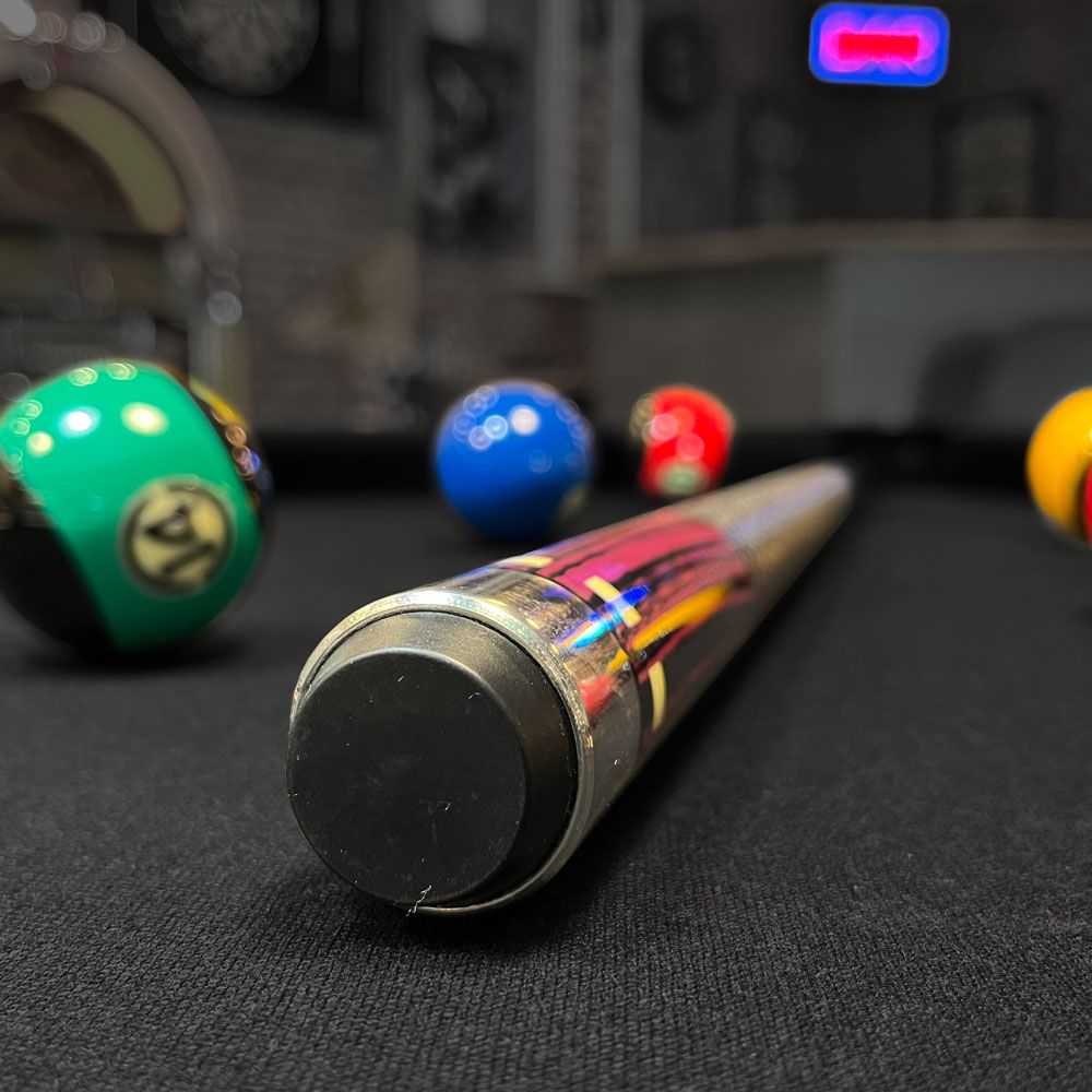 En revanche, pour l'aspect décoration, on est allé à l'essentiel, c'est-à-dire que nous avons fait une décoration en impression comme plus de 80 % des queues de billard américain sur le marché. Ça tient bien dans le temps, c'est esthétique, et ça coûte moins cher à la fabrication. Du coup, ça permet de mettre plus de qualité sur les organes de jeu comme la flèche, la virole, et le procédé.
