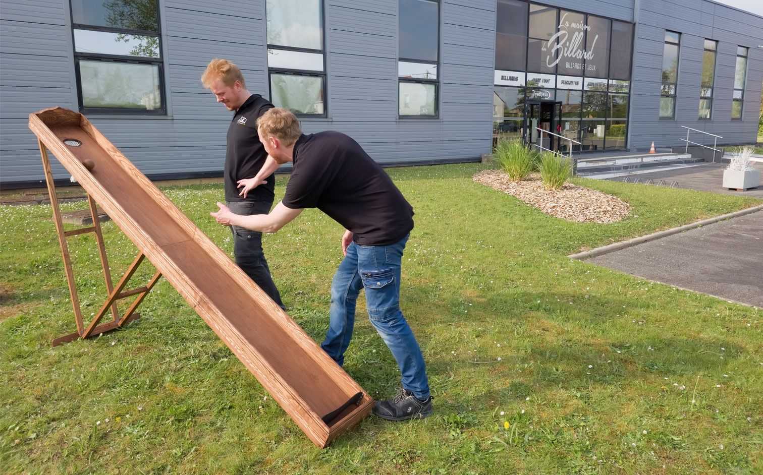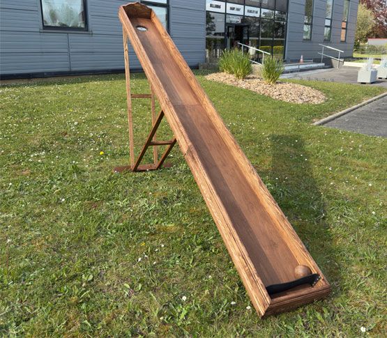 La Boule à la Pente est entièrement fabriquée dans notre atelier du Nord-Pas-de-Calais, en circuit court, avec des essences de bois locales sélectionnées pour leur robustesse et leur beauté. Ce n’est pas seulement un jeu, c’est une pièce d’artisanat, pensée pour les pros qui veulent proposer des animations soignées.