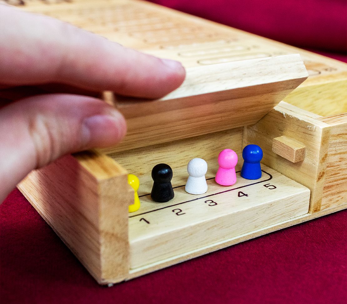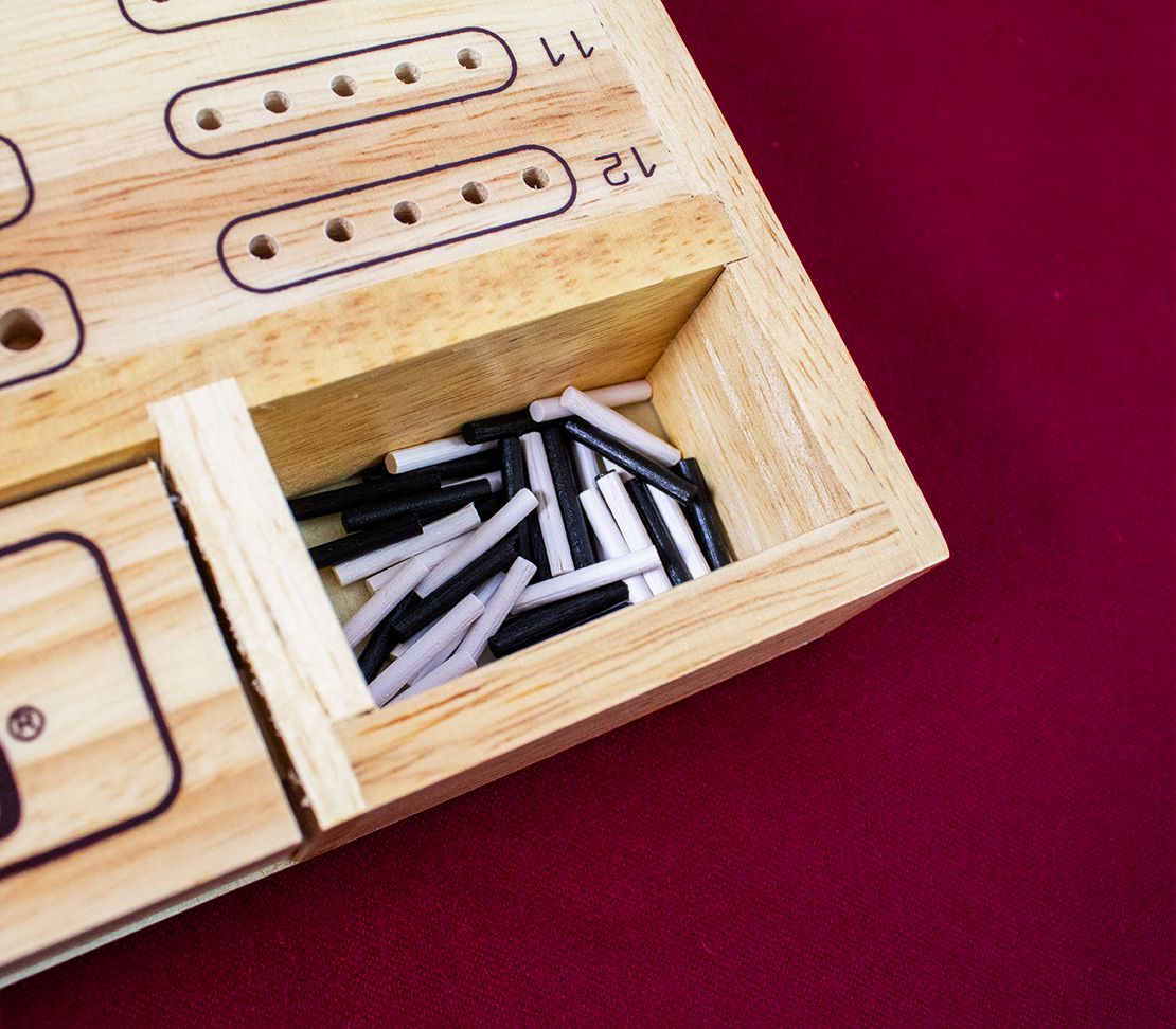 Pour garder le rythme et éviter de perdre les précieux bâtonnets d'indices, le plateau du Mastermind en bois intègre un réservoir astucieux dédié au stockage des marqueurs noirs et blancs.