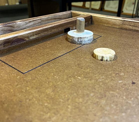 C’était le challenge n° 1 pour fabriquer ce jeu : il fallait une surface ultra-lisse pour que vous ayez la sensation de jouer sur coussin d’air. Nous avons donc trouvé un panneau en bois composite qui offre une surface de jeu multidirectionnelle pour le palet.