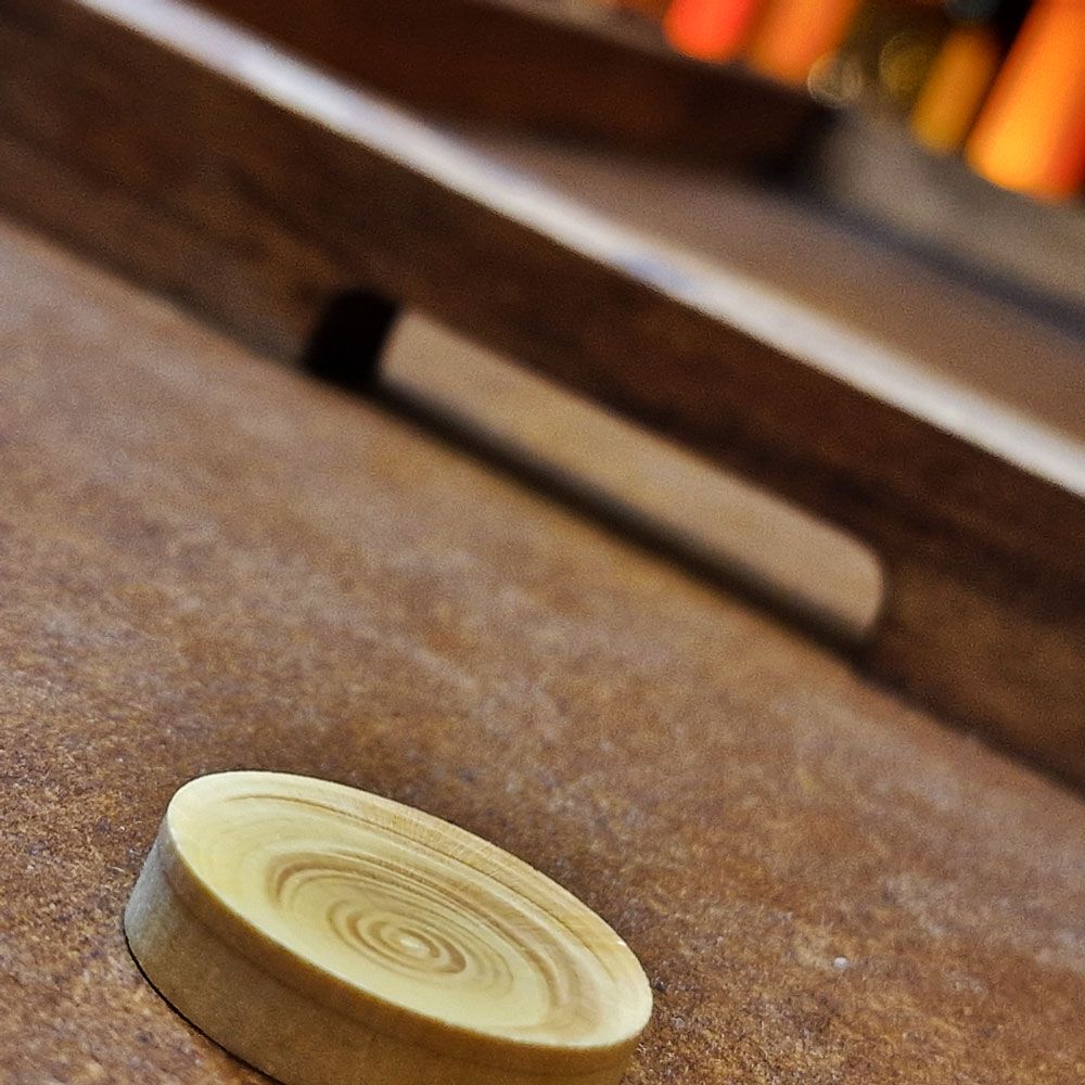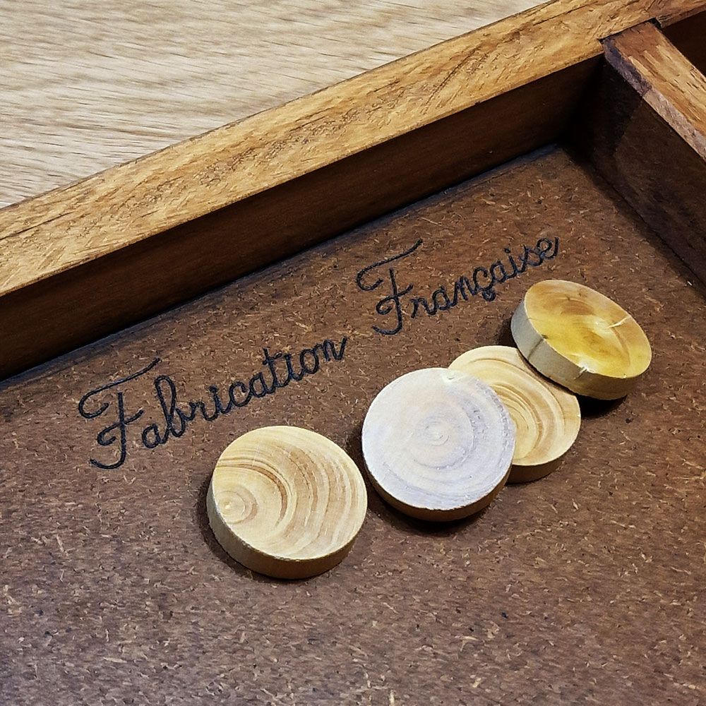 À chaque partie, les palets vont s'entrechoquer et cogner sur les parois. Il faut donc qu'ils soient très résistants ! Pour cela, nous avons sélectionné des palets en buis jurassien, un bois français très dur et très solide.