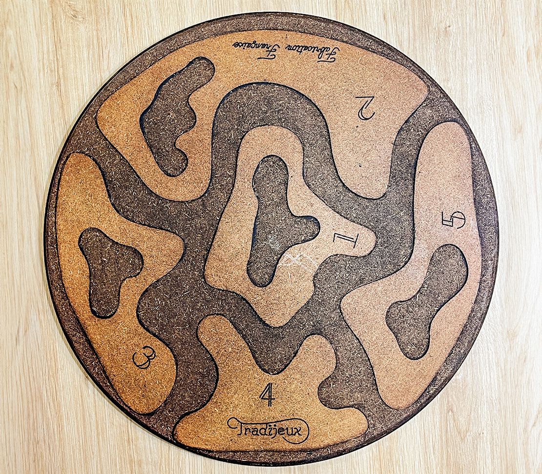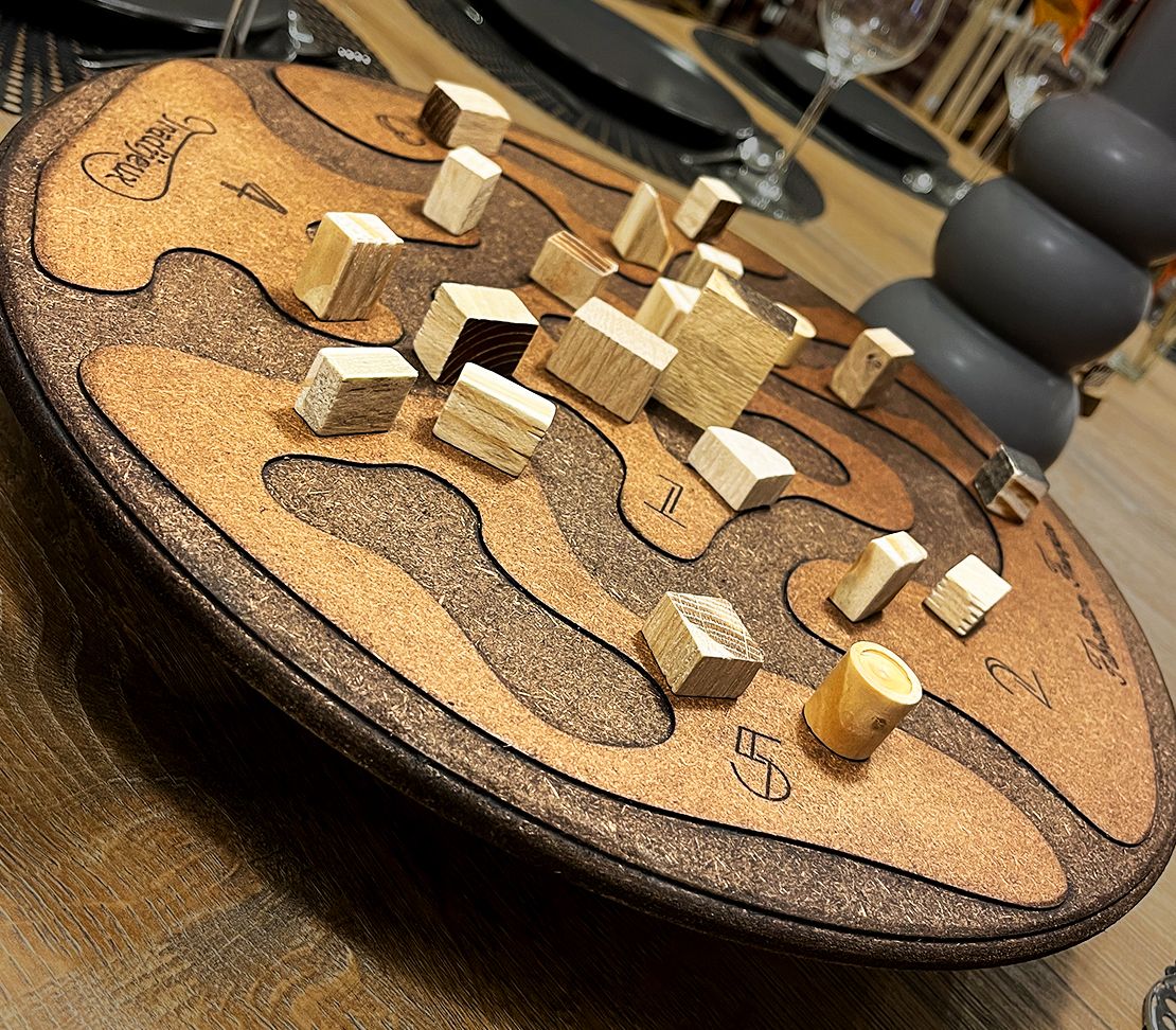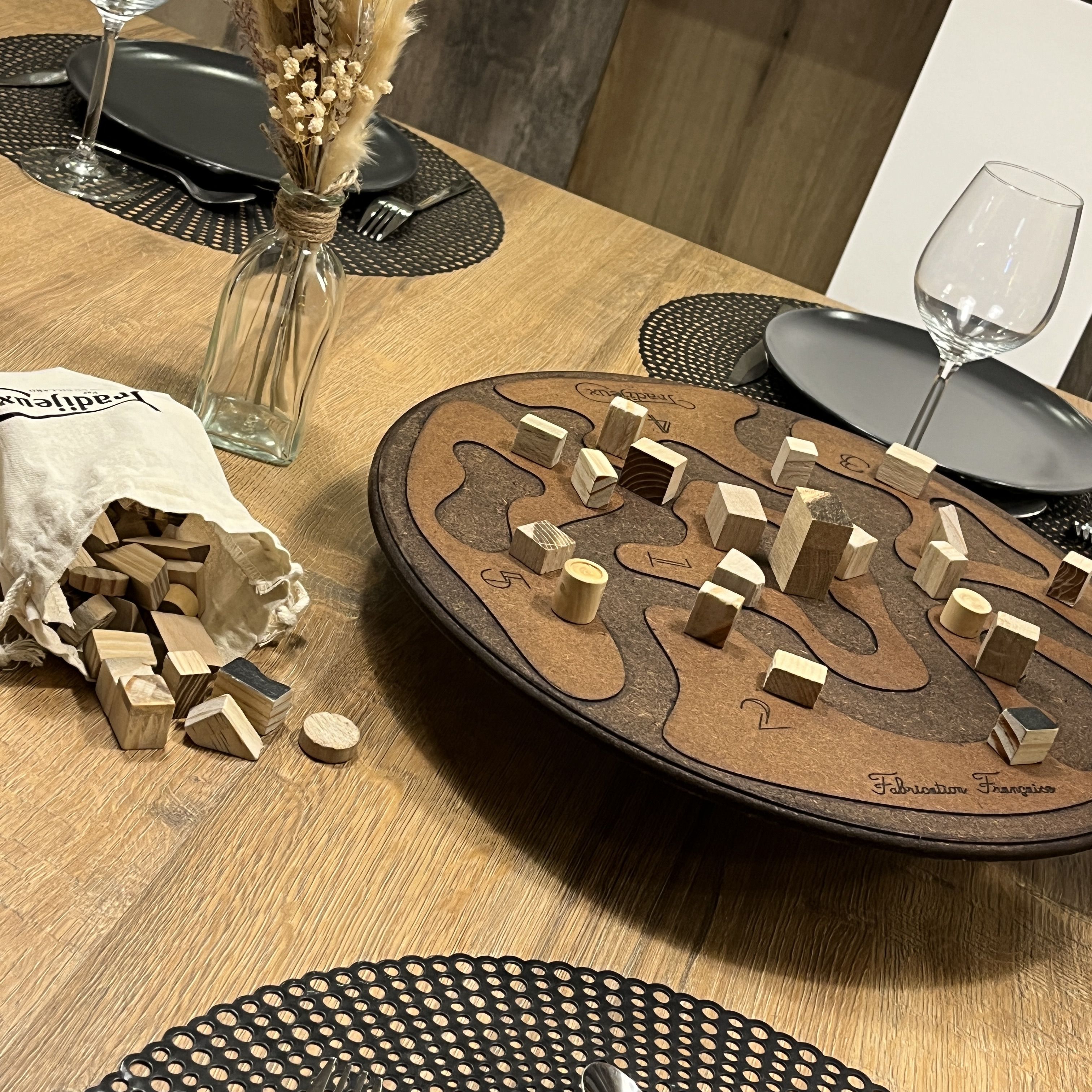 Vous l’avez bien compris, ce jeu est fabriqué de A à Z dans notre atelier. De la fabrication du plateau, à la base du jeu, même les pièces sont issues de chutes de bois que nous redécoupons au bon format. Nous sommes heureux de pouvoir vous fournir un jeu 100 % local.