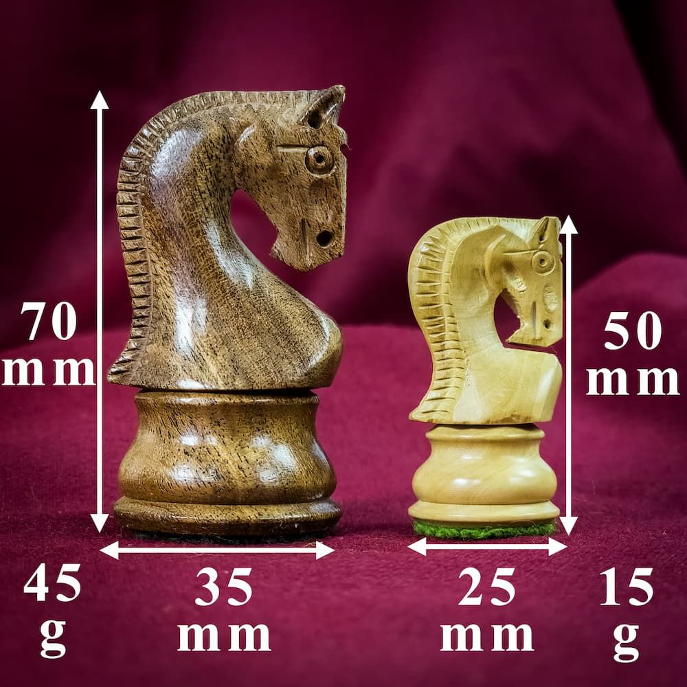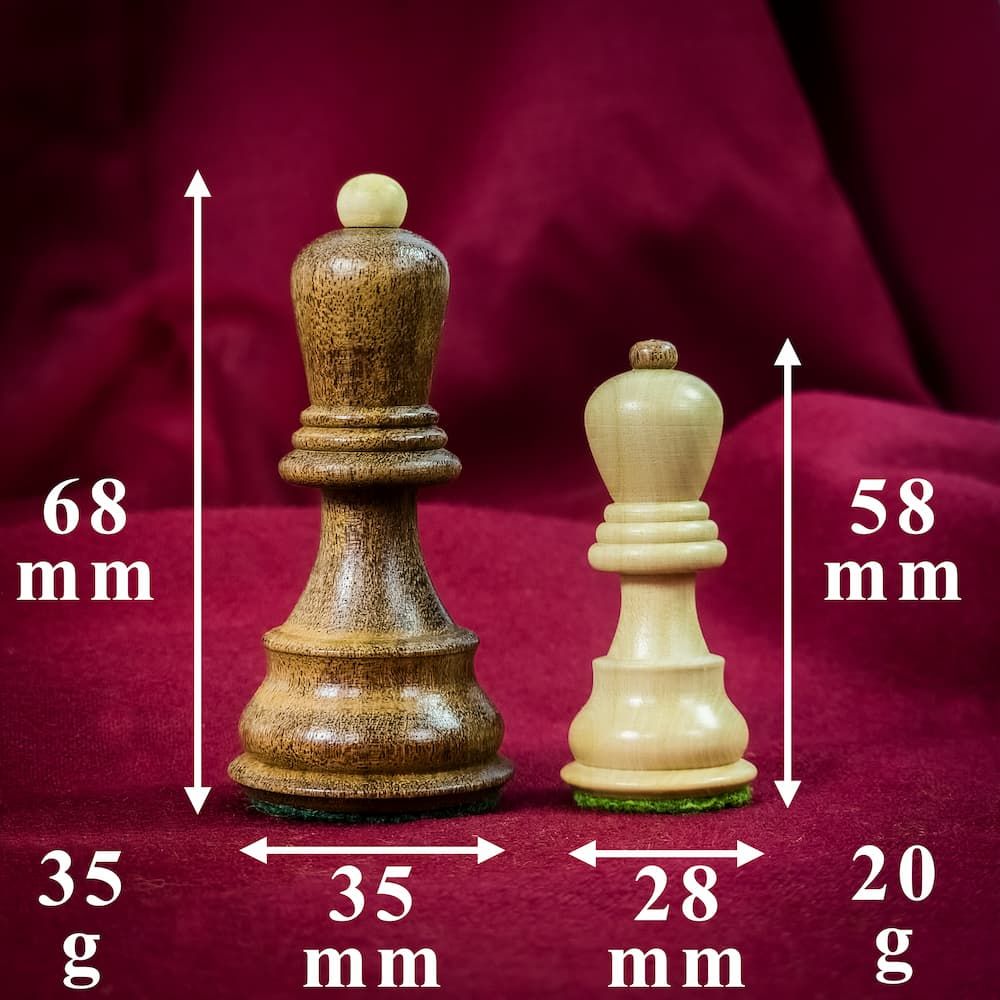 Chaque pièce est sculptée en bois massif (buis et acacia) avec une précision chirurgicale. Polies, lestées et habillées d’un feutre discret sous leur base, elles offrent un toucher agréable dès les premiers coups. Le plateau, lui, mêle subtilement placage noyer et érable, ce qui lui permet de joliment se patiner avec le temps, là où d’autres jeux d’échecs se ternissent.