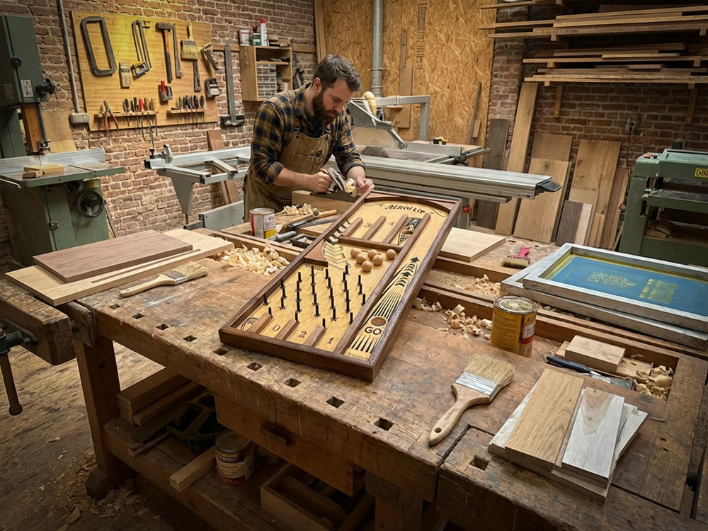Scie à format, raboteuse, pinceau, sérigraphie, vernis… avant d’arriver dans votre salon, ce flipper vintage passe entre les mains de nos menuisiers.