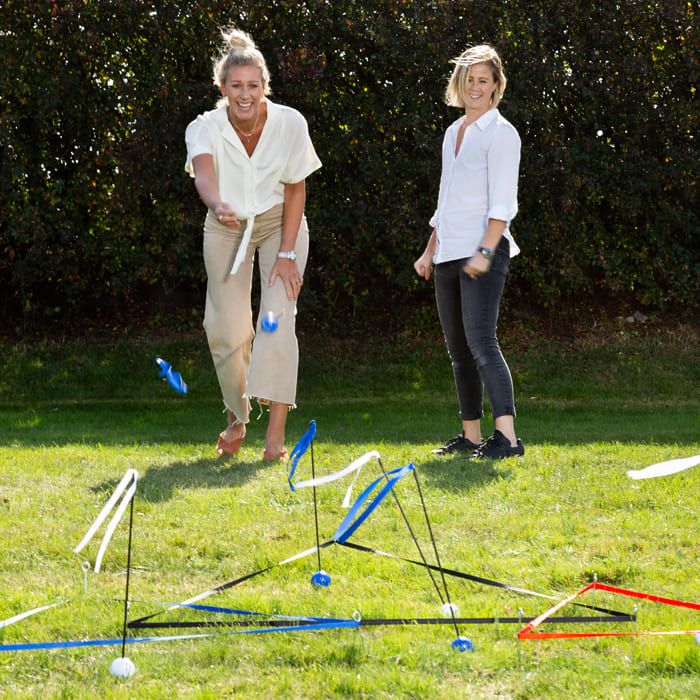 Chaque couleur de triangle délimité définit le nombre de points à gagner : 1, 3 ou 5 points. Les joueurs se placent ensuite à 10 mètres de l’installation de jeu et tentent d’envoyer leurs fléchettes dans la zone qui rapporte le plus de points : exactement comme un jeu de fléchettes classiques. Mais ici, elles ne sont pas pointues, donc pas de risque de se blesser. Les joueurs tentent leur chance à tour de rôle et celui qui remporte le plus de points gagne la partie. Vous pouvez jouer en plusieurs manches.