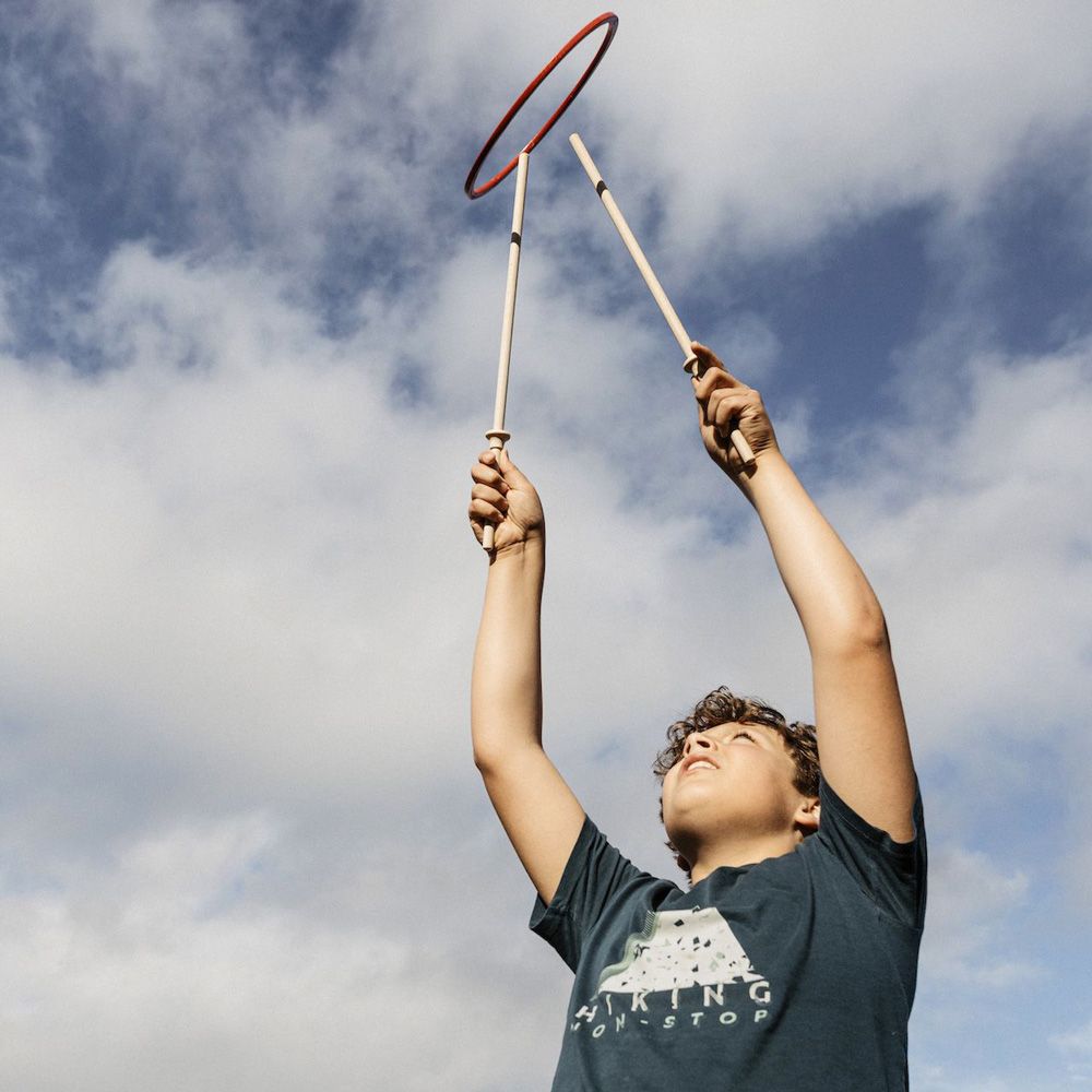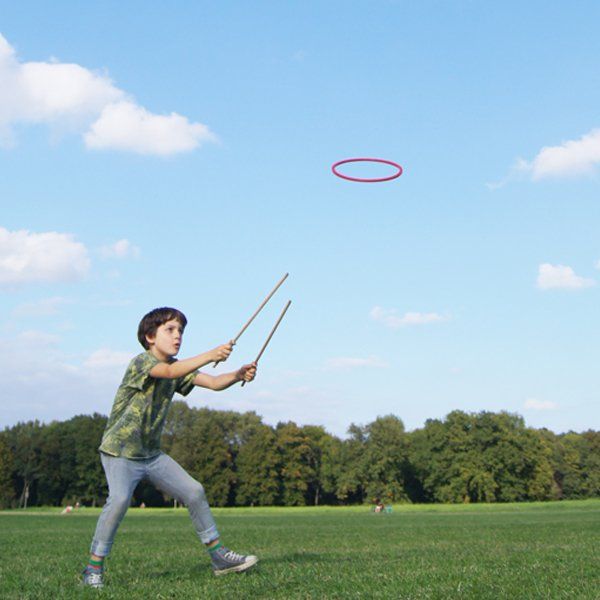 Faites le choix de rattraper le cercle avec un seul bâton et vous avez encore un autre jeu. Vous n’avez pas assez de place pour lancer votre anneau très loin ? Plantez vos bâtons dans le sol et tentez de jeter l’anneau autour de ceux-ci. Et pourquoi ne pas attribuer plus de points lorsque vous atteignez les cibles les moins proches ? Vous le voyez, il n’y a pas de limites à l’imagination.