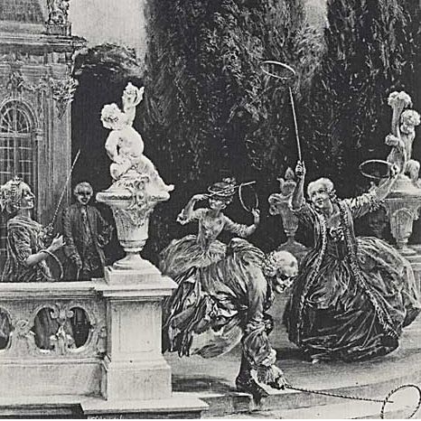 À cette époque, il est appelé « jeu de grâces ». C’est généralement les fillettes qui y jouaient, en face à face. La règle du jeu était similaire. L’enfant rattrape avec 2 baguettes l’anneau en bois qui lui est envoyé. Pour le relancer, il place ses bâtons en croix puis écarte les bras en effectuant un mouvement vers l’avant. L’anneau s’envole ainsi dans les airs.