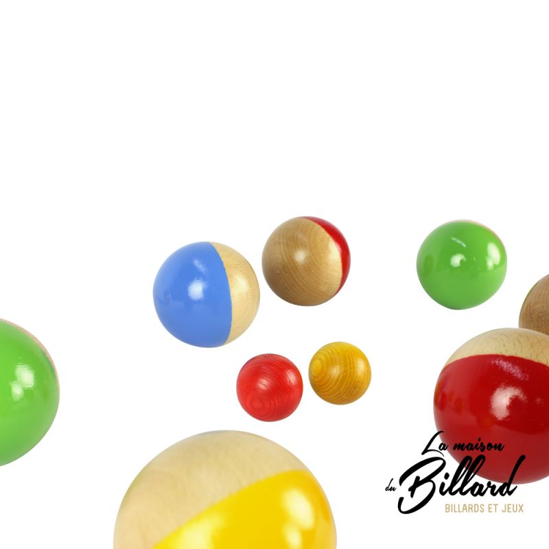 Ce jouet en bois est fabriqué par une famille d’artisans jurassiens. Tout comme notre entreprise, ils développent leur savoir-faire depuis 3 générations. Ces boules de pétanque ont un design atypique : elles sont laquées sur une moitié uniquement. Elles permettent de bien identifier les joueurs tout en conservant le charme du bois, visible sur l’autre moitié.