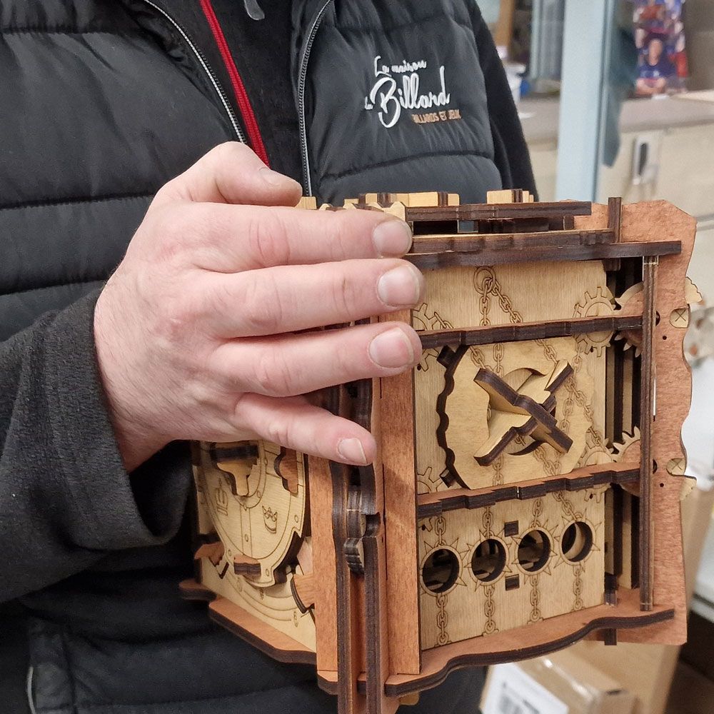 Nous sommes allés en Allemagne rencontrer le petit génie qui pense et conçoit ses escape games en bois. Il s'appelle André et nous avons tout de suite été fascinés par la façon dont il pense ses énigmes et comment il parvient à nous plonger dans différents univers (pirate, robot et ici médiéval).