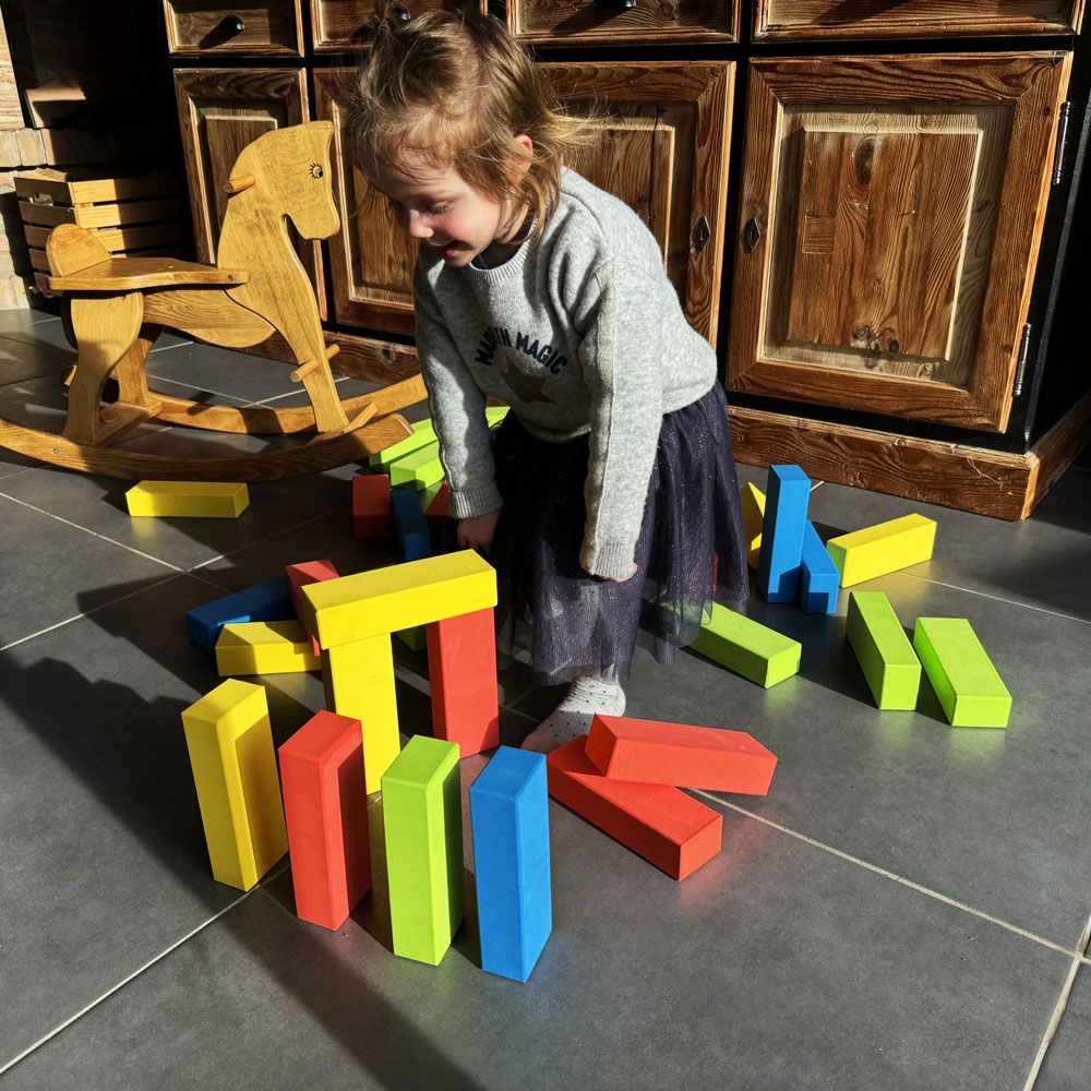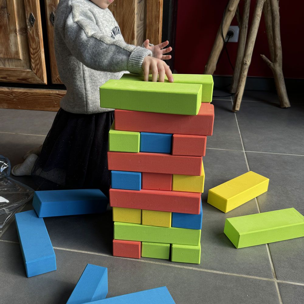 Voici un Jenga géant, fabriqué en mousse, qui vous permettra de multiples activités. Jeu de construction, jeu d'adresse, dominos, rallye géant... Avec un peu d'imagination, vous arriverez à occuper un ou plusieurs enfants facilement grâce à ce jeu qui sort de l'ordinaire.