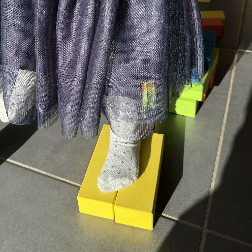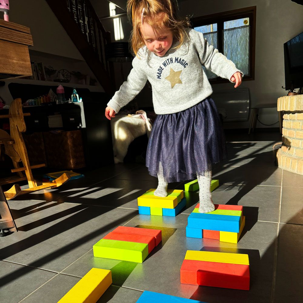 Les briques sont suffisamment compactes pour qu'un enfant puisse marcher dessus sans les abîmer (supportent jusqu'à 50 kg). Ainsi, créez un parcours de briques où l'enfant devra traverser le chemin sans toucher le sol. Un véritable jeu d'adresse qui apprendra la notion d'équilibre à vos enfants.