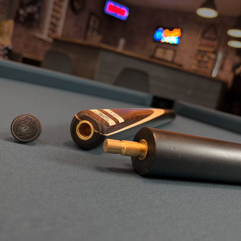 Nous avons choisit des matériaux de qualité pour pouvoir réalisé ce fût élégant. Le contraste entre le bois sombre ancien et claire qui apporte un charme et un caractère à cette queue de billard.