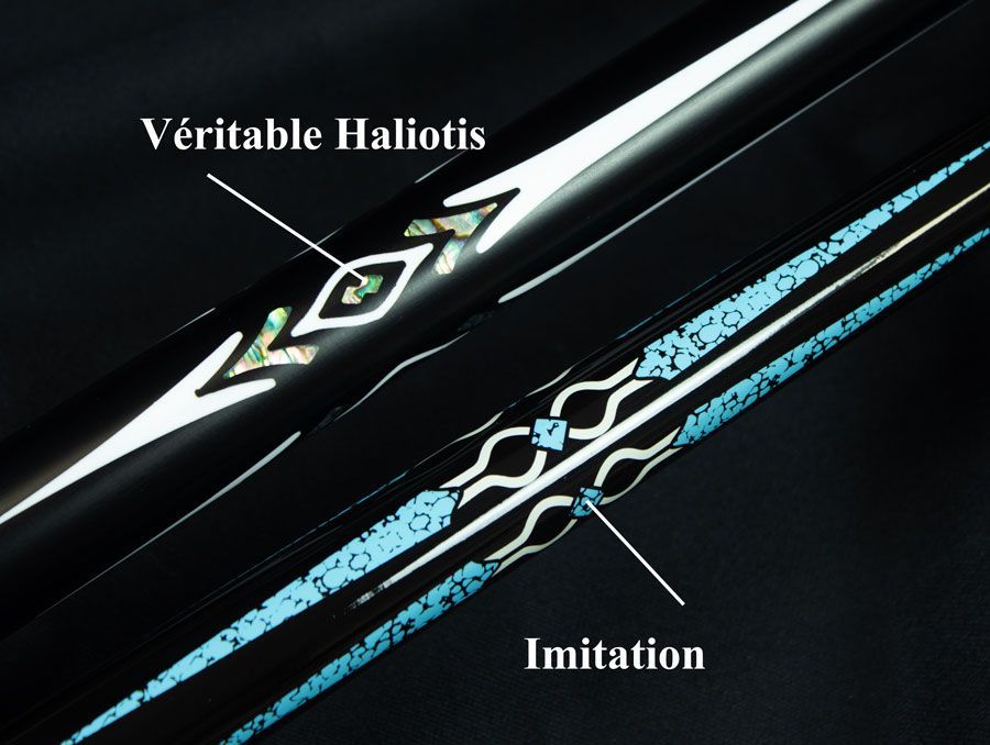 Souvent imitée sur des queues plus bas de gamme, ici, vous avez de véritables incrustations d’Haliotis. Son fût est travaillé avec une précision de joaillier, intégrant de véritables incrustations d'Haliotis.